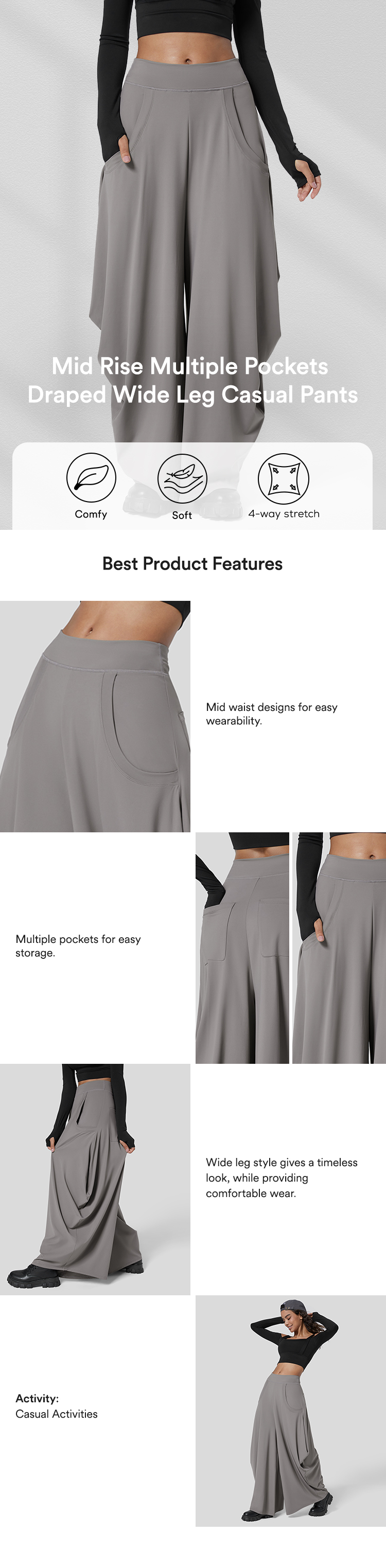 Mid Rise Pockets Draped Wide Leg Casual Pants